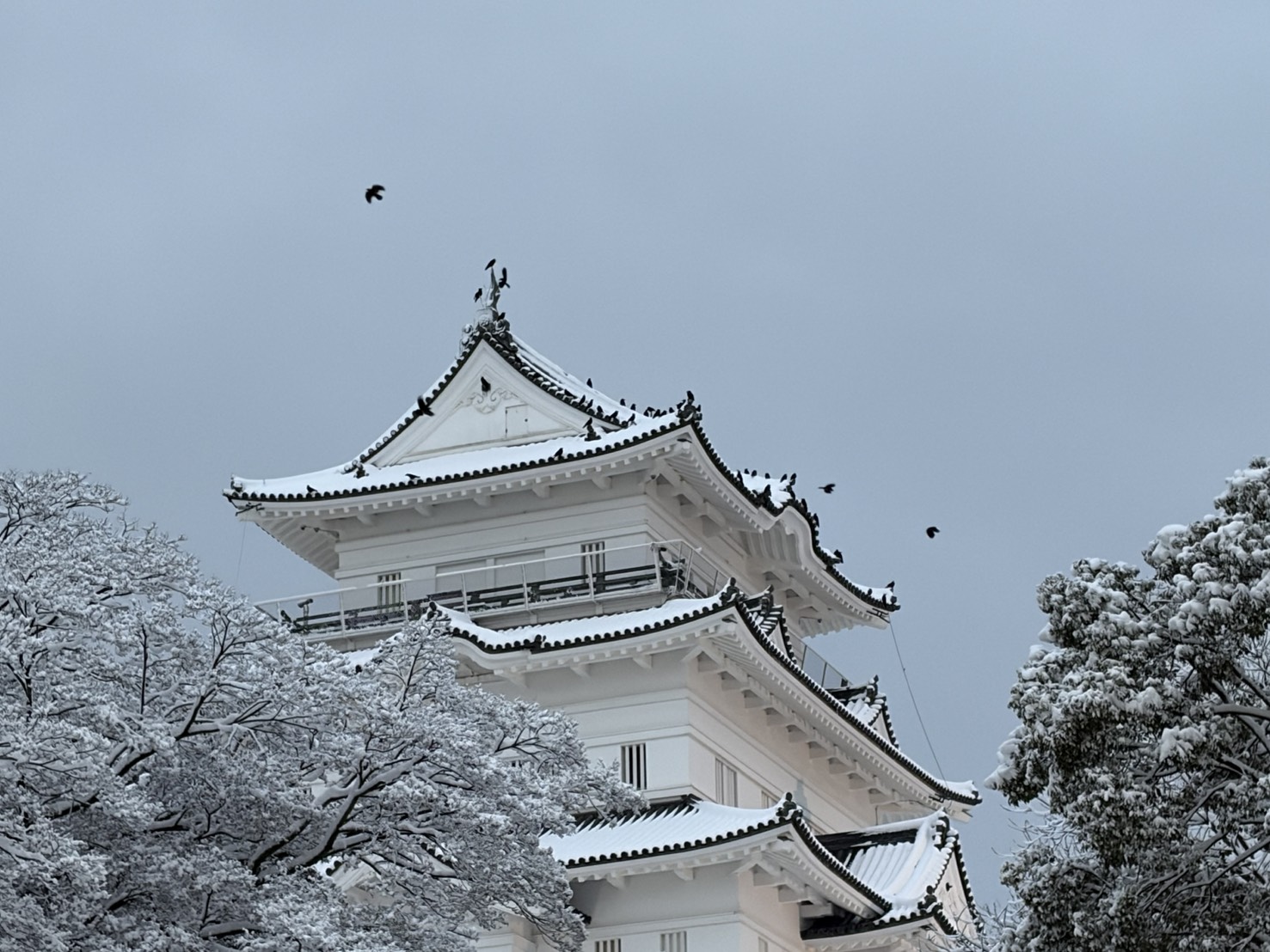 この写真は2月に大雪が降った日の夕方の小田原城です。